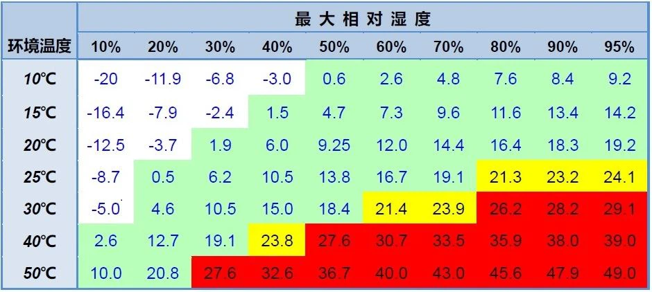 Внезапното повишаване на температуратаотМай ни накара да почувстваме усещането за лято. С повишаването на температурата трябва да обърнем внимание на предотвратяването на кондензацията на лазера при висока температура и висока влажност на въздуха. Когато температурата на водата за лазерно охлаждане е зададена по-ниска от съответната температура на точката на оросяване в таблицата по-долу, ще се получи конденз.